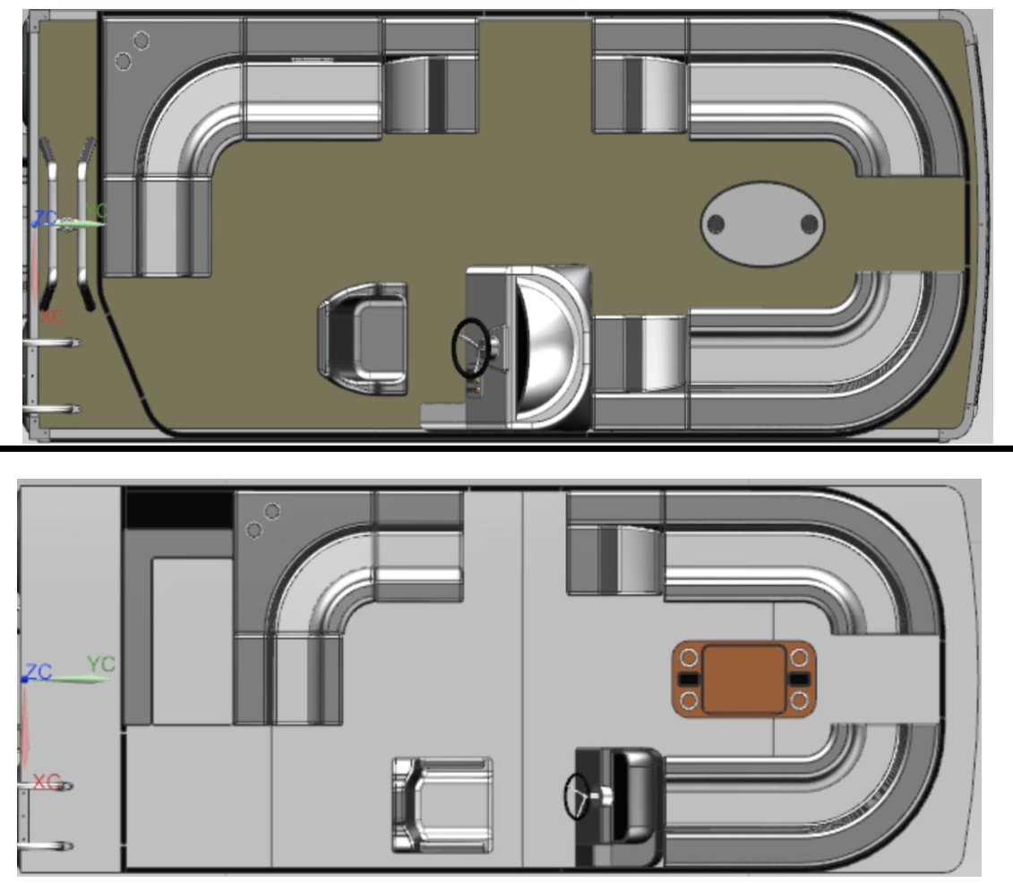 All boats come with at least 2 layouts. These are the two layouts for the 17ft pontoon. The upper one allows for 6 seats whereas the lower one has 5 seats and a toilet/change room